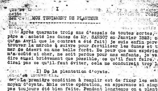 En 1863, il publie « Mon testament de planteur » à l’intention de ses enfants. Il écrit : « …je suis enfin parvenu à trouver la marche à suivre pour fertiliser les dunes et transformer ce désert en une belle forêt… »