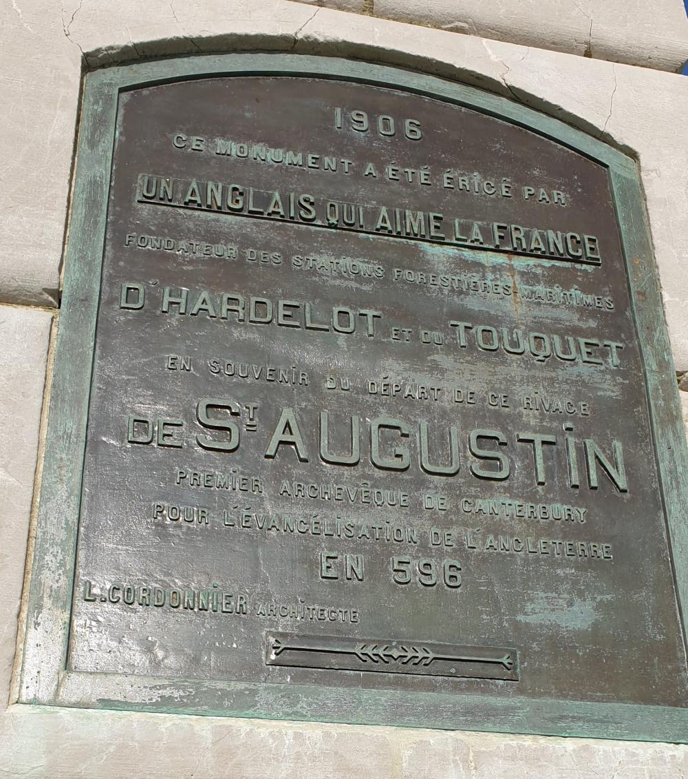 Dans cet esprit, il conçut le projet d’ériger une croix monumentale rappelant le départ de Saint Augustin vers l’Angleterre en 596. Et il situa l’embarquement de l’évangélisateur et de ses compagnons bénédictins sur la grève d’Hardelot.