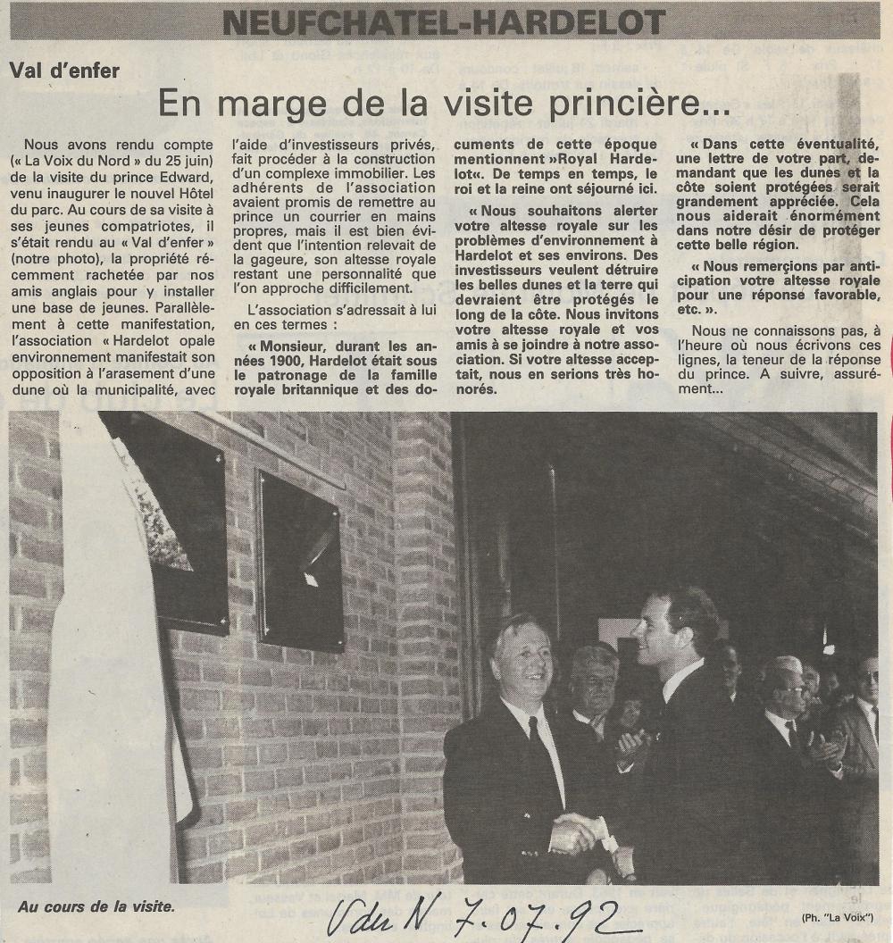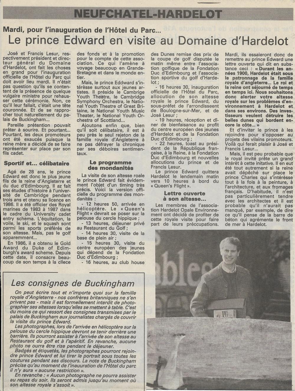 Le Prince Edward en visite à Hardelot-inauguration de l'Hôtel du Parc la V du N 29juin 1992