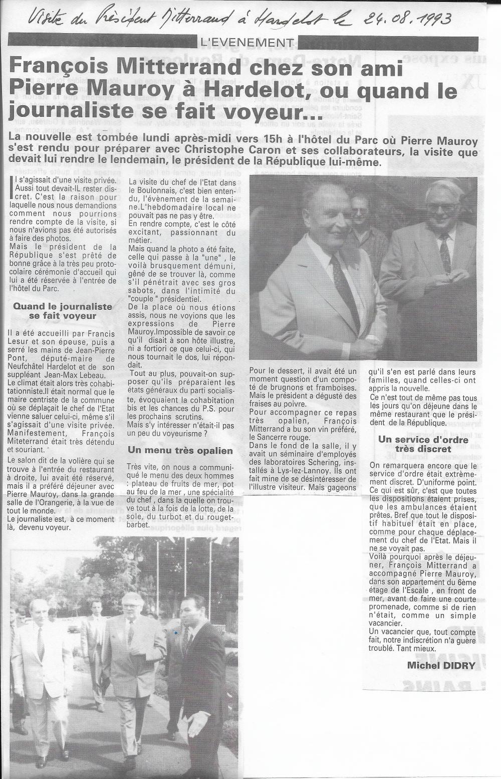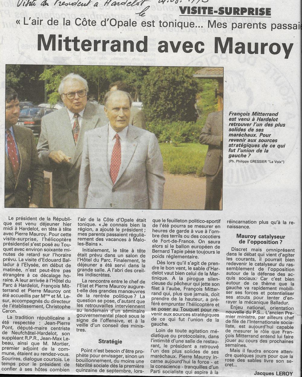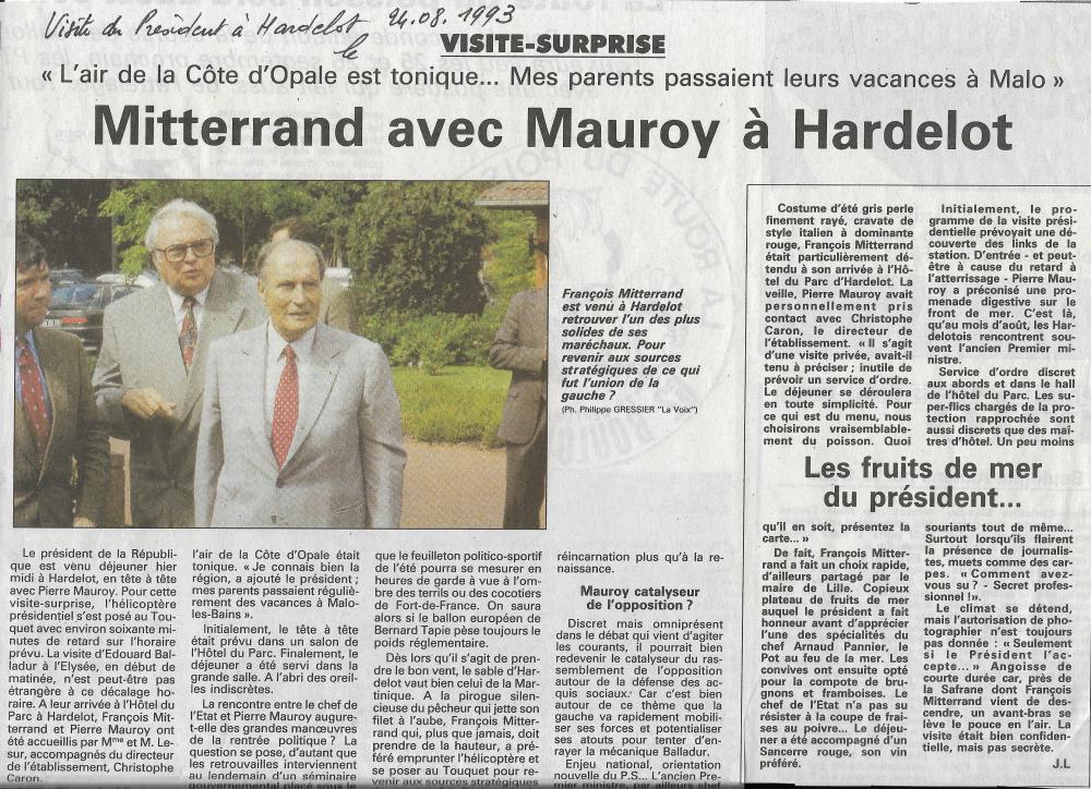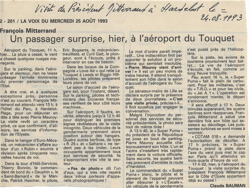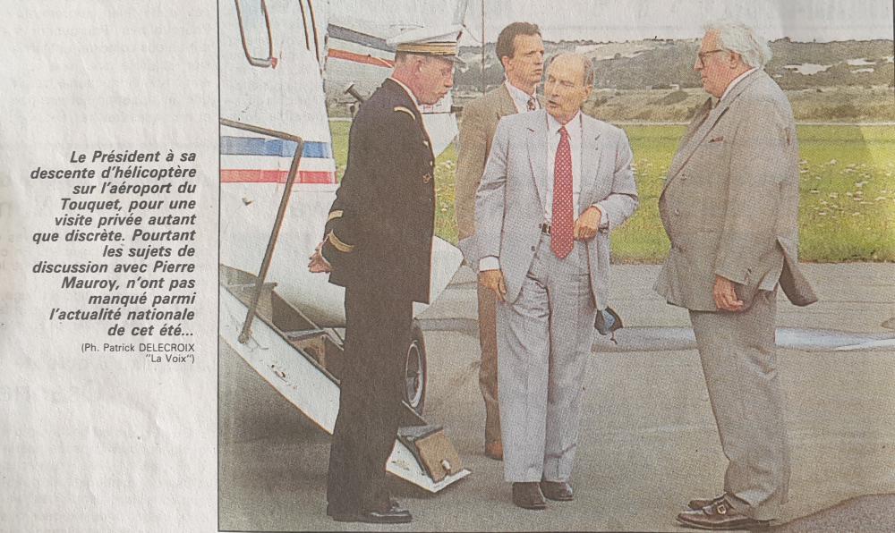 Invité par Pierre MAUROY son ancien Premier ministre de 1981 à 1984, François Mitterrand arrive à l’aéroport du Touquet le 24 août 1993 à 13h40. Il est accueilli à sa descente d’hélicoptère par Pierre Mauroy